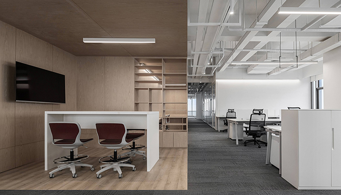 半開放隔間:玻璃隔斷(80% 通透 + 20% 磨砂),隔音棉 / 吸音板。